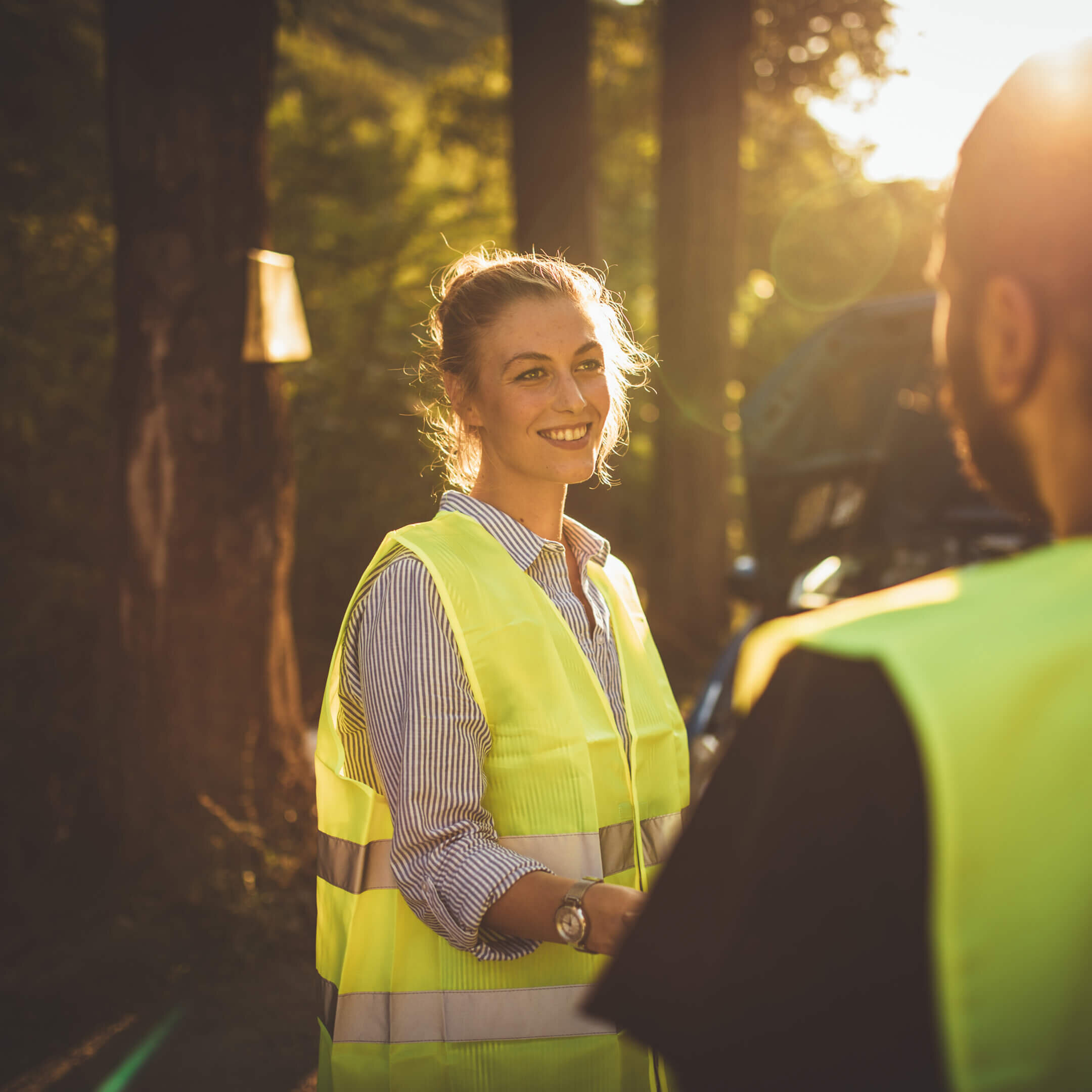 Ein Unfall oder eine Panne können aufwühlend sein. Atme erstmal tief durch, schalte deine Warnblinkanlage ein, ziehe deine Warnweste an und stelle das Warndreieck sicher auf. Deine Sicherheit hat höchste Priorität.