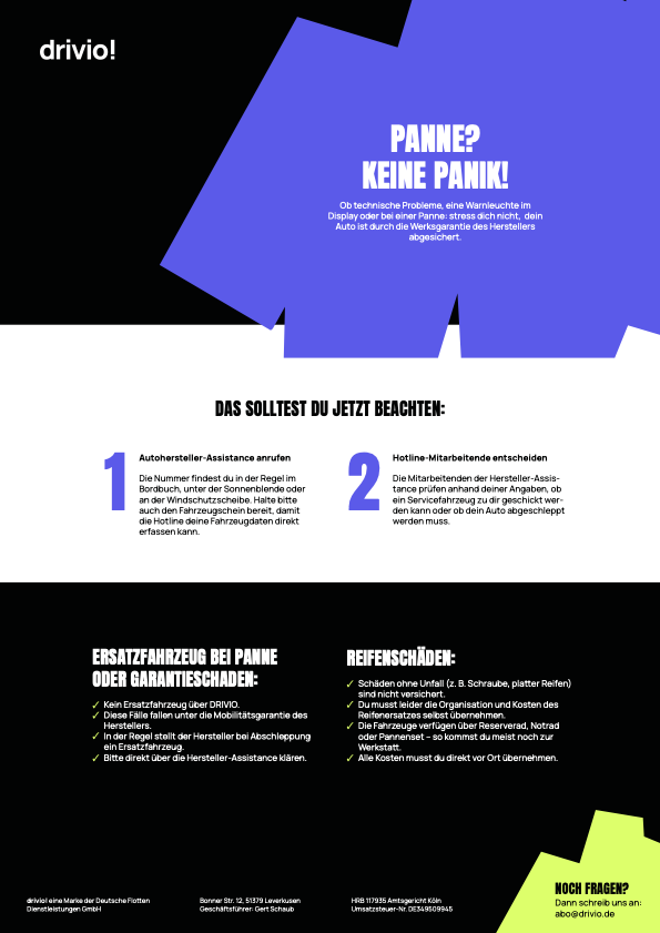 Melde dich bitte per E-Mail an abo@drivio.de bei uns. Wir nennen dir die nächstgelegene Werkstatt, welche du anfahren kannst. Lasse dir einen Kostenvoranschlag erstellen und sende uns diesen zu. Bitte lasse keine Reparaturen ohne Freigabe von uns durchführen.