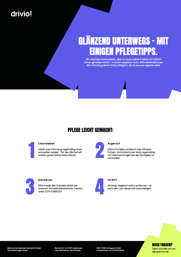 Schau gerne auch in unseren FAQ-Bereich. Dort findest du viele Antworten auf mögliche Fragen. Du kannst uns auch eine E-Mail schreiben an abo@drivio.de oder unser Kontaktformular nutzen.
