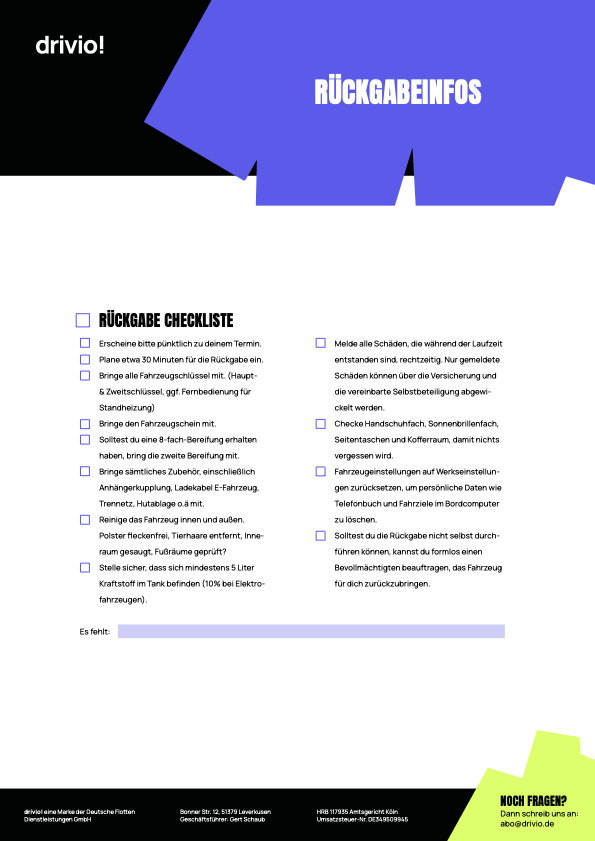 Es können zusätzliche Regelungen durch drivio! oder den Partnern zutreffen. Diese findest du auf der Fahrzeug-Detailseite oder den entsprechenden AGBs.
