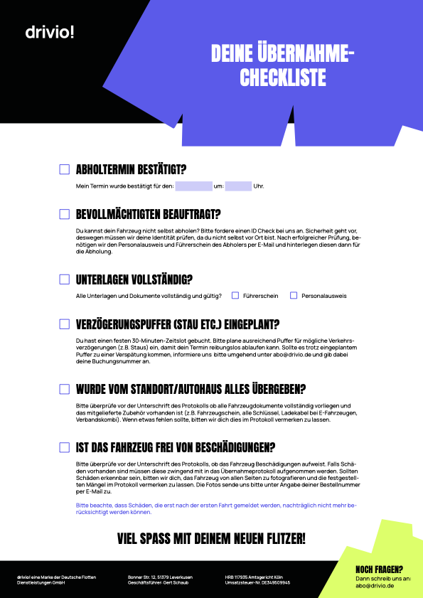 Im ersten Schritt benötigt drivio! nur deine persönlichen Daten wie Name, Adresse, Zahlungsmittel etc., welche bereits mit der Bestellung übermittelt werden. Sollten noch weitere Informationen benötigt werden, setzt sich drivio! mit dir in Verbindung.