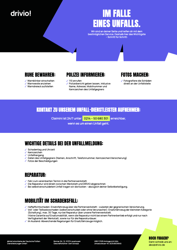 Bitte schreibe uns eine E-Mail an abo@drivio.de. Folgende Details sind wichtig für die Unfallmeldung:
