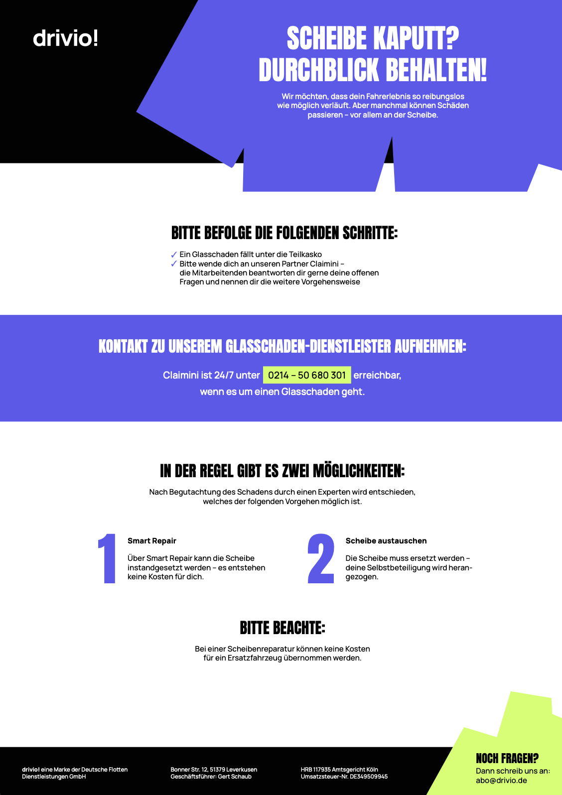 - Melde den Schaden mit Bildern bei uns unter abo@drivio.de